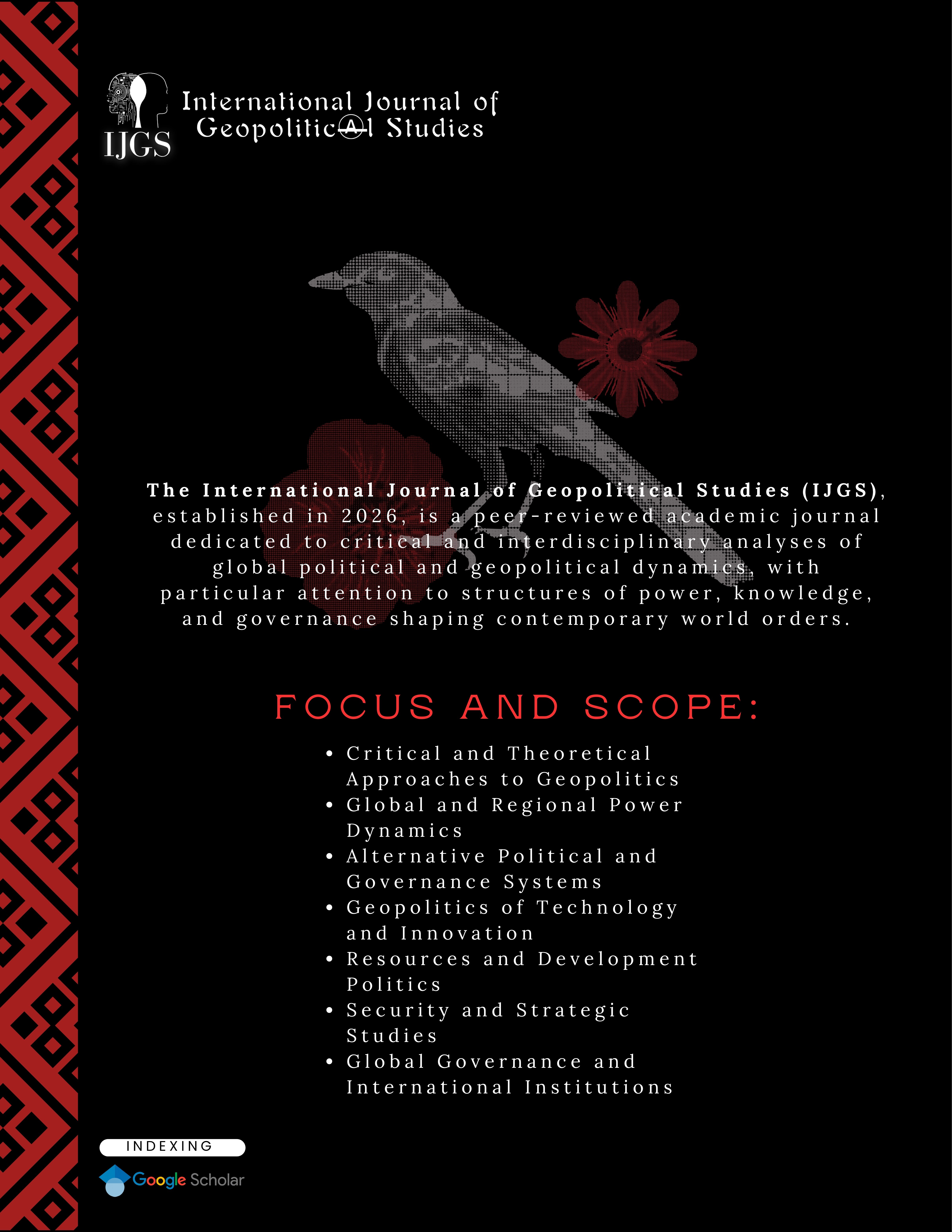 International Journal of Geopolitical Studies (IJGS), established in 2026, is a peer-reviewed academic journal dedicated to critical and interdisciplinary analyses of global political and geopolitical dynamics, with particular attention to structures of power, knowledge, and governance shaping contemporary world orders.